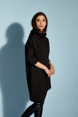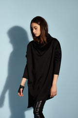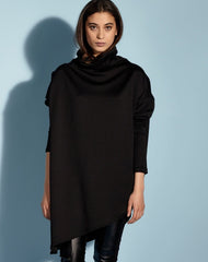 Buzo Maya, cuello alto y amplio, mangas largas, de silueta ancha y corte asimétrico en la parte inferior. Confeccionado en tejido de punto