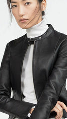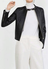 Chaqueta en cuero sintético, con cuello redondo, cremallera, manga larga, cremallera en la manga