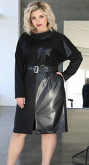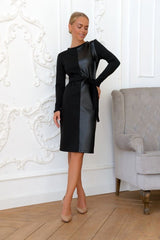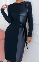 Vestido corte ajustado, escote redondo, manga larga, cinturón, confeccionado en tela gamuzada y cuero sintético