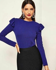 Blusa Kiara, cuello redondo, manga larga con bolero en los hombros. Confeccionada en tela fay.